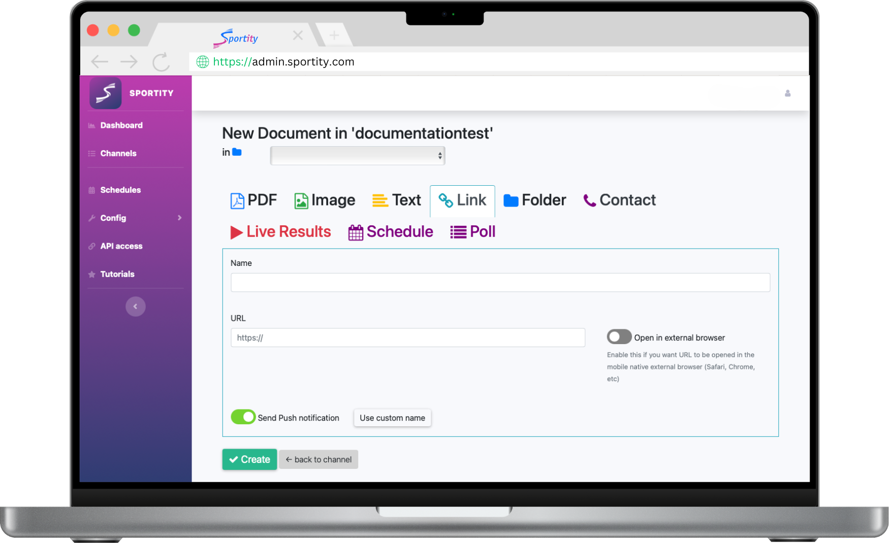The switch Open in external browser will force App to open this link in a Browser App (like Sadari, Chrome, etc.) rather then within the Sportity App. If you want to place your file into a folder, select a previously created folder from the drop-down list in 📁.